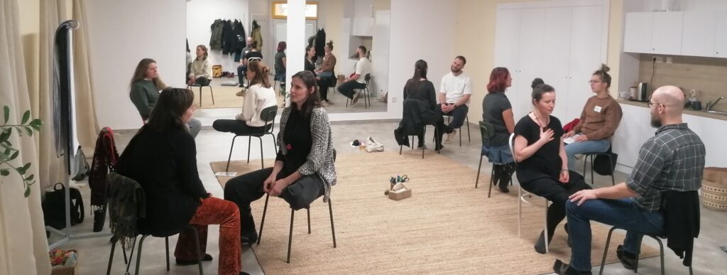 Důležitou součástí výcviku je meditace ve dvojicích a zkoumání kvalit neboli lidských potřeb. Tato praxe nás posouvá ve schopnosti napojit se na různé lidi a nervové systémy a přitom zůstat „u sebe“.